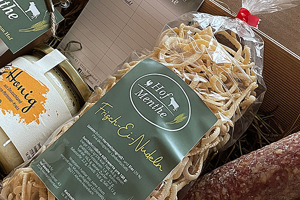 Auf Anfrage stellen wir individuelle Präsentkörbe mit regionalen Produkten aus unserem Hofladen und von Partnerbetrieben zusammen.